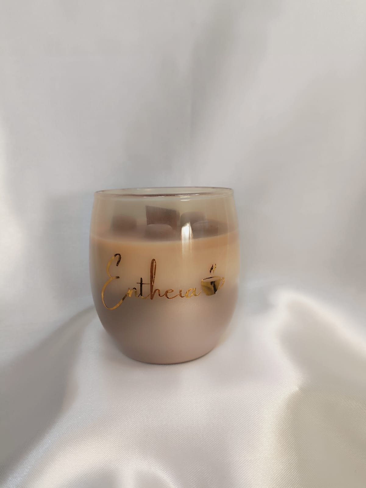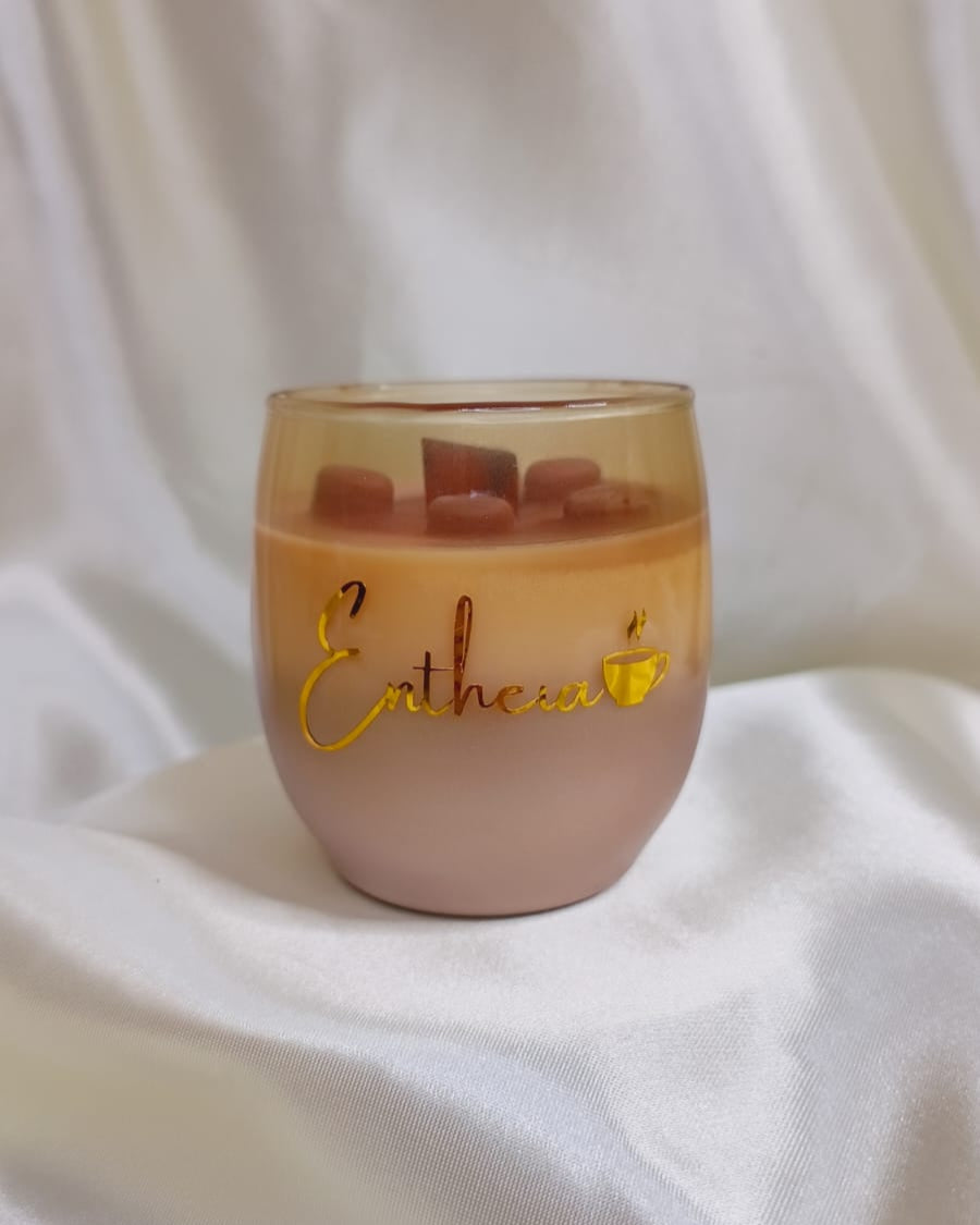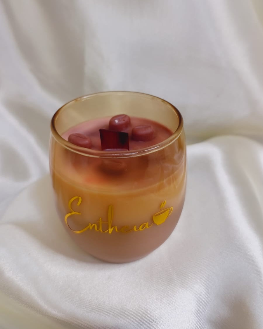 Cada vela es una obra de arte sensorial. En su interior, granitos de café se incrustan en la cera de soya 100% natural, creando una textura visual única. Su cálido envase de vidrio reciclado color ámbar dorado, fabricado artesanalmente, resplandece con la luz del pabilo de madera, cuyo suave crepitar añade un toque de intimidad.